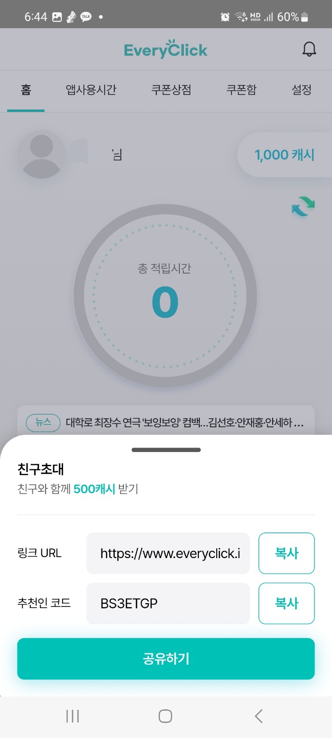 맨 밑에 추천인코드가 있는데 추천인을 입력하면 500원을 주기때문에 기입하시는 것이 좋습니다. 게다가 처음 시작하면 500원을 더 줌으로 1000원으로 시작하실 수 있습니다.