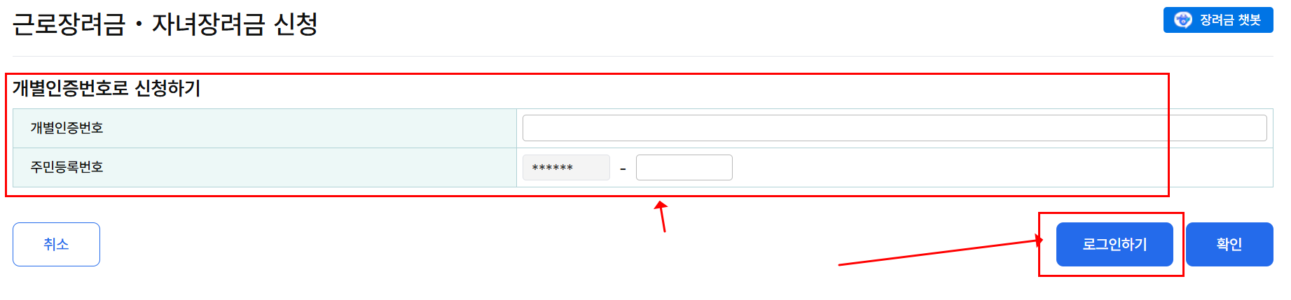 - * 홈택스 모바일앱 실행 → 전체메뉴 → 장려금ㆍ연말정산ㆍ전자기부금 → 근로ㆍ자녀장려금 정기신청 → 신청하기 → '주민등록번호 7자리'와 '개별인증번호' 입력 → 신청하기